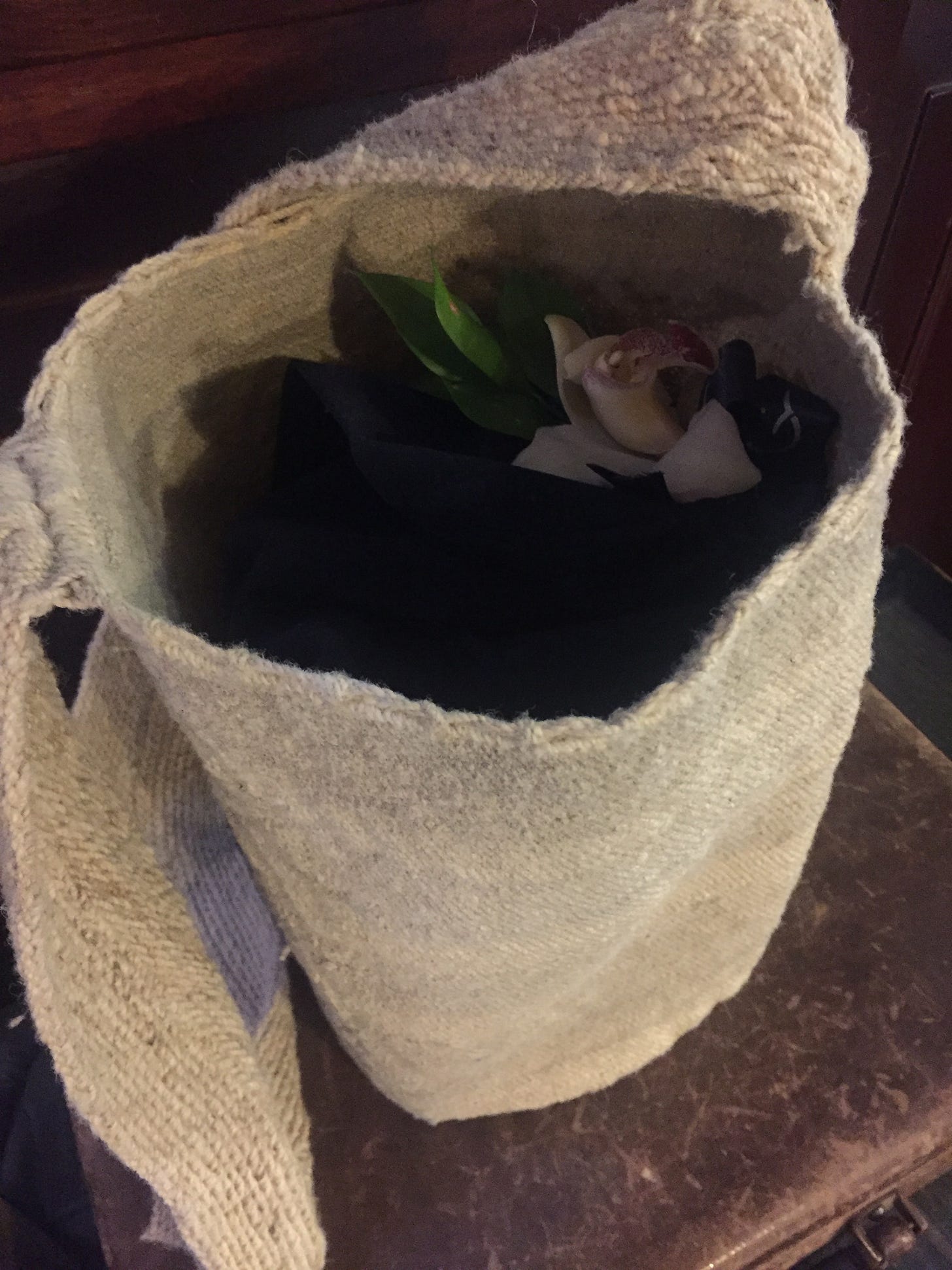 That afternoon, Manuel and his family had taken pity on me and brought me to a local market so I didn’t have to be alone in the hotel. I’ll never forget that and the thousand kindnesses gifted me that weekend in my traumatized state, even with the details now fuzzy around the edges. At one market stall, a family displayed their beautiful hand-crafted shoulder bags. One caught my eye. In truth, I was looking for it. I was told this was the style of bag carried by wise men. Shaman types. That it took a month to weave. It looked the right size for the simple but beautiful wooden box I had been given with my father’s ashes inside. This was how I would carry my father home from our trip to Colombia. I had been looking for something just like this. I found it.